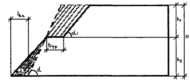 Рис.16 Технологическая схема выполаживания откоса свалок 1b.п. - приращение горизонтальной проекции линии откоса; a - угол естественного откоса отходов; a1 - угол откоса после выполаживания; В - берма безопасности; в - ширина горизонтальном поверхности свалки; Н - высота свалки отходов.