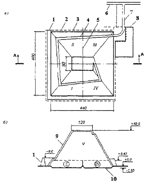 Рис.П.1.1 План и разрез высоконагруженного полигона на плоском рельефе а - план, б - разрез по А-А; I-V - очереди строительства и эксплуатации полигона; 1 - кавальер грунта; 2 - граница полигона; 3 - граница участка складирования ТБО; 4 - временная дорога на участке складирования; 5 - граница очередей эксплуатации; 6 - существующая автомагистраль; 7 - подъездная дорога; 8 - хозяйственная зона; 9 - верхний изолирующий слой; 10 - котлован в основании полигона. Высота полигона Н определяется из условия заложения внешних откосов 1:4 и необходимости иметь размеры верхней площадки, обеспечивающие надежную работу мусоровозов и бульдозеров: Н=Ш:8-н, (3) где Ш - ширина участка складирования ,м; 8 - двойное заложение откосов (4х2); н - показатель снижения высоты полигона, обеспечивающий оптимальные размеры плоской верхней площадки, м. Минимальная ширина верхней площадки определяется удвоенным радиусом разворота мусоровозов и соблюдением правила размещения мусоровозов не ближе 10 м от откоса: Шв=9´2+10´2=38 м Для удобства работ на верхней площадке принимаем ее ширину равной 80 м. Показатель снижения высоты будет: н=80:8=10 м Высота полигона составит: Н=400:8-10=40 м Фактическая вместимость полигона с учетом уплотнения рассчитывается по формуле усеченной пирамиды: где С1 и С2 - площади основания и верхней площадки, м2 Примечание: вместимость котлована в основании полигона не учитывается, так как весь грунт из него идет на изоляцию ТБО. В этих условиях Еф равно Бу - объему уплотненных ТБО. Для верхней плоской площадки составляет: 440-40´8=120 м Ширина верхней площадки будет: 400-40´8=80 м По формуле (4) рассчитываем фактическую вместимость: Еф=(440´400+120´80+400´440´120´80)´40=(176000+9600+41160)х40=3023467 м3 Потребность в изолирующем материале определяется по формуле: В=Ву(1-1/К2) (5) Для изоляции 3023467 м3 уплотненных ТБО потребуется грунт в объеме: Вг=33023467(1-1/К2)=3023467(1-1/1,18)=453520 м3 В рассматриваемых условиях Вг - емкость котлована. Средняя проектируемая глубина котлована в основании полигона определяется по формуле: Нк=1,1´Вг:С1, где 1,1 - коэффициент, учитывающий откосы и картовую схему котлована; Нк=1,1´453520:176000,0=2,83 м Площадь участка складирования разбивается на четыре очереди эксплуатации с габаритами 200´220 м и площадью 44000 м2 - 4,4 га. Каждая из этих очередей эксплуатируется с учетом укладки пяти рабочих слоев ТБО (2 м ТБО и 0,25 м грунта). Общая высота составит: 2´5+0,25´5=11,25м В том числе над поверхностью земли (черных отметок) высота насыпи за каждую очередь составит; 11,25-2,83=8,42 м. Объем котлована одной очереди будет: 153520:4=113380м3 Наращивание высоты с отметки 9 м до 39 м и окончательную изоляцию слоем 1 м условно можно считать пятой очередью эксплуатации. Срок эксплуатации каждой очереди в среднем 4 года. Грунт из котлована I очереди складируется в кавальер для его использования при окончательной изоляции полигона. Кавальер размещается по внешней границе I, III и IV очередей. Длина кавальера составляет: 410+475=885 м. Площадь поперечного сечения кавальера будет: 113380:885=128,1м2 Кавальер имеет форму трапеции с шириной основания 24 м, шириной по верху 4,5 м и высотой 9 м. Площадь поперечного сечения составляет: (4,5+24) ´9:2= 128,25м2 Площадь, занимаемая кавальером грунта, составляет: 885´24=21240 м2=2,1 га Планировка хозяйственной зоны с примыкающими к ней сооружениями приведена на рис. П.1.2
