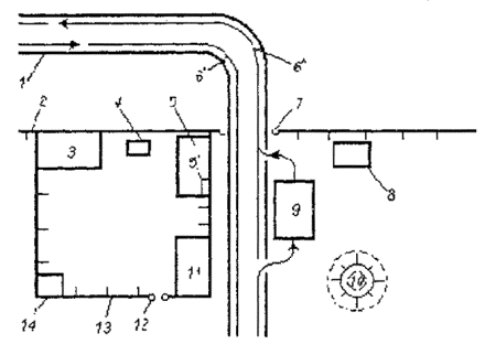 Рис.П.1.2 План хозяйственной зоны и примыкающих сооружений 1 - подъездная дорога; 2 - ограждение полигона; 3 - площадка для складирования сборно-разборных временных дорог; 4 - трансформаторная подстанция; 5 - административно-бытовое здание; 5" - окно конторского помещения; 6 - транспортный поток прибывающих машин; 6" - то же убывающих машин; 7 - ворота полигона; 8 - грязеотстойник; 9 - площадка для дезинфекции; 10 - противопожарный резервуар; 11 - навес (помещение) для машин и механизмов; 12 и 13 - ворота и ограждение хозяйственной зоны; 14 - склад ГСМ. Планировка хозяйственно-бытового здания представлена на рис. П.1.3. Здание состоит из двух блоков, разделенных стенкой, имеющей газопароизоляцию. Основной вход в здание запроектирован с территории зоны, что ограничивает посещение его водителями мусоровозов и грузчиками. Второй выход является запасным на случай пожара.