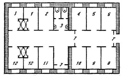 Рис.П.1.3 План производственно-бытового здания 1 - мужской гардероб и душ; 2 - сушилка спецодежды; 3 - санузел; 4, 5 - комнаты мастера и начальника; 6 - конторское помещение; 7 - тамбур; 8 - комната отдыха и приема пищи; 9 - лаборатория; 10 - сторожевая охрана; 11- кладовая; 12 - женский гардероб и душ. По другую сторону подъездной дороги, напротив производственного бытового здания, размещается площадка дезинфекции мусоровозов. Взаимное размещение зоны и дезинфекционной площадки обеспечивает выезд машин на площадку и выезд после дезинфекции с территории полигона без пересечения транспортного потока прибывающих на полигон мусоровозов. В засушливых районах для сбора и обезвреживания фильтрата, как исключение, может применяться бессточная схема. По этой схеме осветленный в грязеотстойниках фильтрат самотеком подается на насосную станцию. С целью удешевления системы в насосной станции монтируется один песковой насос, резервный насос (второй) предусматривается сметой, но хранится на складе. Насосной станцией в летний период стоки перекачиваются в сборно-разборную систему трубопроводов. Из перфорированных труб обеспечивается дождевание или разлив по поверхности покрытых промежуточной изоляцией рабочих карт полигона. Распределение фильтрата принимается из расчета до 30 м3 в сутки воды на участок площадью 1 га в течение 6 месяцев в году. Схема сооружений дана на рис. П.1.4. Для полигонов, организуемых на срок менее 6 лет, и полигонов, принимающих менее 120 тыс. м3 ТБО в год, функции производственно-бытового здания выполняют изготавливаемые промышленностью типовые передвижные вагоны. Их характеристика приведена в табл. П.1.3.