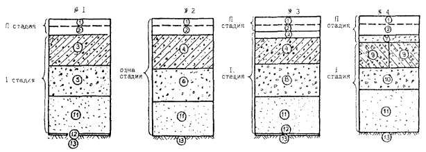 Рис. 1.1. Типовые конструкции магистральных районных (№ 1 и 2) и жилых (№ 2) улиц, внутриквартальных монолитных (№ 2, 3) и с применением железобетонных плит (№ 4) дорог: 1 - мелкозернистый асфальтобетон; 2 - крупнозернистый асфальтобетон плотный; 3 - цементобетон марки 300; 4 - цементобетон марки 200; 5 - тощий бетон М75; 6 - тощий бетон М100; 7 - мелкий щебень, высевки; 8 - известняковый щебень марки 400 - 600; 9 - железобетонные плиты; 10 - технологический слой из щебня; 11 - песок среднезернистый; 12 - синтетический нетканый материал дорнит, применяемый при неблагоприятных грунтовых гидрологических условиях; 13 - грунт земляного полотна. Примечания: 1. Перед осуществлением работ II-ой стадии при наличии трещин и разрушений в конструкциях № 1 и 3 рекомендуется укладывать выравнивающую прослойку 7. 2. В конструкциях № 2 и 3 может быть применено бетонное покрытие вместо асфальтобетонного. 1.9. При проектировании и строительстве магистральных, жилых улиц и внутриквартальных дорог кроме требований и положений настоящей инструкции должны выполняться требования соответствующих ГОСТов, СНиПов и других нормативных документов, указанных в тексте и в списке документов в конце инструкции. 2. КОНСТРУКЦИИ МАГИСТРАЛЬНЫХ УЛИЦ РАЙОННОГО ЗНАЧЕНИЯ, ЖИЛЫХ УЛИЦ И ВНУТРИКВАРТАЛЬНЫХ ДОРОГ.Типовые конструкции.2.1. Дорожные одежды в районах массового жилищного строительства должны обладать прочностными и эксплуатационными характеристиками, обеспечивающими их нормальную работу в заданных режимах на 1-й и 2-й стадиях эксплуатации. 2.2. Принимаемые проектные решения должны обеспечивать прочность, выносливость и устойчивость дороги в целом и отдельных ее конструктивных слоев под воздействием автомобильных нагрузок и климатических факторов.