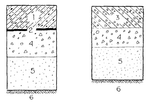 Рис. 1.2. Типовые конструкции дорог на территориях детских садов, школ, больниц, жилых зданий, устраиваемые в одну стадию: 1 - цементобетон М350 - 100; 2 - пергамин или полиэтиленовая пленка; 3 - плиты с бортами; 4 - технологический слой из щебня; 5 - песок среднезернистый; 6 - грунт земляного полотна. Примечание. При неблагоприятных грунтово-гидрологических условиях по земляному полотну укладывается синтетический нетканый материал - дорнит. 2.3. Магистральные и жилые улицы, внутриквартальные дороги включают следующие конструктивные слои (рис. 1.1, 1.2): покрытие, упругую прослойку, основание, песчаный подстилающий слой, синтетический материал - дорнит (при неблагоприятных грунтовых условиях). При использовании синтетических прослоек типа дорнит толщина песчаного слоя может быть уменьшена при соответствующем технико-экономическом обосновании. 2.4. Основание выполняется на 1-й стадии из цементобетона марки 200, если движение транспорта намечено по слою из крупнозернистого асфальтобетона, и марки 300, если движение намечено по цементобетону. Конструктивный и технологический слой устраивают из малоцементного (тощего) бетона марок 75 - 100 или из смесей щебеночных, уплотняемых в соответствии с ТУ 400-24-150-86. 2.5. В основаниях из малоцементных (тощих) бетонных смесей марок 75 - 100 устраивают поперечные температурные швы в конце рабочей смены по типу ложных швов сжатия /14/. 2.6. В основаниях из пластичного бетона устраивают поперечные температурные швы по типу ложных швов сжатия через: - 8 - 10 м для бетона М200; - 5 - 6 м для бетона М300 /21/. 2.7. Покрытие улиц и дорог на 2-й стадии строительства устраивают из двух слоев асфальтобетона или слоя бетона М350, М400. 2.8. На 1-й стадии строительства дождеприемные решетки и крышки люков смотровых колодцев должны устанавливаться на отметку верха покрытия. При устройстве покрытия на 2-й стадии крышки люков колодцев и дождеприемные решетки выводятся на проектные отметки установкой дополнительных колец или применением регулируемых оголовков. 2.9. Строительство дорог на территориях детских садов, школ, больниц, жилых зданий должно выполняться непосредственно перед сдачей объектов в эксплуатацию. Покрытие следует выполнять из сборных железобетонных плит, объединенных с бортами, или монолитного цементобетона марки не менее 350, укладываемого по литьевой технологии с применением суперпластификаторов (рис. 1.2). Температурные швы сжатия в монолитном покрытии устраиваются при ширине проезжей части 3,5 - 4 м через 6 м, при ширине проезжей части 5,5 - через 5 м. Нагрузки.2.10. Дороги, предназначенные для движения построечного транспорта, проектируют на автомобильную нагрузку Н-30 (таблица 2.1), дороги на территориях детских садов, школ, больниц и жилых зданий, устраиваемые в одну стадию, - на Н-10. Нормативные параметры автомобильной нагрузки