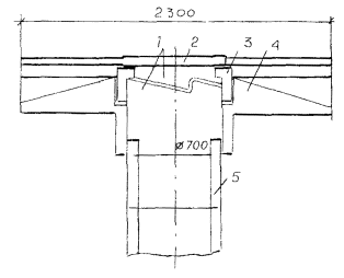 Рис. 3.2. Конструкция регулируемого оголовка смотрового колодца: 1 - регулировочное кольцо; 2 - крышка люка; 3 - поморочное кольцо; 4 - опорная плита; 5 - колодец. 3.34. Производство работ по устройству песчаного подстилающего слоя должно производиться в соответствии с требованиями СНиП 3.06.03-85. Автомобильные дороги. 3.35. Песок доставляют на объект автомобилями-самосвалами. Разравнивание песка производят по способу «от себя» бульдозерами или автогрейдерами, соблюдая проектный уклон. Толщина слоя песка должна соответствовать заданной толщине слоя с учетом запаса на уплотнение. Отклонение по толщине слоя допускается не более 1 см. 3.36. Катки для уплотнения песка выбирают в зависимости от вида песка и толщины слоя в соответствии с табл. 3.2. Уплотнение следует производить до требуемой плотности (Куп = 0,98 - 1,0) при влажности близкой к оптимальной (табл. 3.1). Если влажность песка меньше оптимальной, его следует увлажнять поливомоечной машиной. 3.37. Пески или песчано-гравийная смесь, применяемые для подстилающего слоя, должны иметь коэффициент фильтрации не менее 3 м/сут., содержание мелкозема не выше 7 %, а пылеватых и глинистых частиц не более 5 % по массе. 3.38. Коэффициент уплотнения подстилающего слоя должен быть не менее 0,98, а наибольший просвет под 3-метровой рейкой - 1 см. 3.39. Для предотвращения смерзания песка в зимнее время рекомендуется его пропитка 2-процентным раствором хлористого кальция (CaCl2). Необходимое количество CaCl2 на 1 м2 поверхности слоя приведено в табл. 3.4.