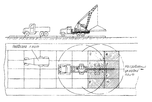 6.13. Технологическая последовательность работ по строительству сборных покрытий тротуаров включает следующие этапы: рытье и уплотнение корыта, установку бортового камня, устройство подстилающего слоя, устройство основания и покрытия, в том числе заполнение швов. 6.14. Перед укладкой плит должны быть разбиты и закреплены на основании две ограничивающие линии, от одной из которых начинается укладка плит. 6.15. Работу по укладке плит следует производить способом «на себя» по схеме, указанной на рис. 6.1. Для соблюдения уклона и ровности покрытия при укладке плит рекомендуется: выполнение работ начинать с устройства верстового ряда, укладываемого вдоль бортового камня или кромки газона, или поперек тротуара; укладку производить в одну или в обе стороны от верстового ряда; укладку плит вести навстречу уклону. 6.16. Погрузочно-разгрузочные работы и монтаж покрытия из плит размером сторон 100 см производят при помощи навесного оборудования к 3 - 5-тонному автокрану или автопогрузчику. 6.17. Плиты с размером сторон до 50 см можно укладывать в покрытия специальным вакуум-захватом круглой формы диаметром 400 мм; а их окончательная посадка до проектной отметки производится вибратором размером 40×40 см. 6.18. Фигурные плиты и элементы мощения укладывают вручную или плитоукладчиком с готового покрытия. 7. РЕГУЛИРОВАНИЕ ДВИЖЕНИЯ ГОРОДСКОГО ТРАНСПОРТА ПО ПОСТРОЕННОЙ МАГИСТРАЛЬНОЙ УЛИЦЕ РАЙОННОГО ЗНАЧЕНИЯ.7.1. С целью обеспечения безопасности движения городского транспорта и безопасности пешеходов на построенной магистральной улице районного значения производят расчленение транспортных и пешеходных потоков во времени и пространстве. Так на пересечениях улиц для расчленения потоков применяют принудительное регулирование движения сигналами светофоров, т. е. попеременный пропуск транспорта и пешеходов то в одном, то в другом направлении.