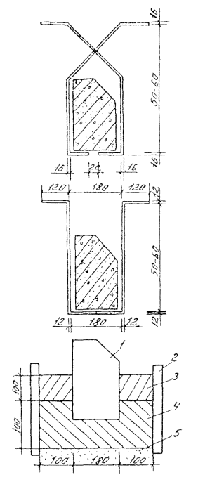 Рис. 4.1. Схема установки однометровых бортовых камней: 1 - бортовой камень; 2 - опалубка; 3 - участок бетонирования; 4 - бетонная подготовка; 5 - песчаный подстилающий слой. 4.8. Длинномерные бортовые камни длиной 3 и 6 м, устанавливают непосредственно на песчаное основание или основание дорожной одежды, предусмотренное проектом, под стыками камней укладывают бетонные подкладки размером 40×20×10 см. Установку камней производят автокранами грузоподъемностью 3 т или автопогрузчиками. 4.9. Ширина шва между бортовыми камнями не должна превышать 5 мм. Заполнение швов производят цементным раствором состава 1 : 4, после чего расшивают раствором состава 1 : 2. 5. СТРОИТЕЛЬСТВО АСФАЛЬТОБЕТОННЫХ ПОКРЫТИЙ.5.1. Строительство асфальтобетонных покрытий производят при температуре весной и летом не ниже 5 °С, осенью - не ниже 10 °С. За 2 - 4 часа до укладки смеси следует произвести обработку поверхности старого покрытия битумной эмульсией с расходом 0,3 - 0,4 кг/м2 (за исключением случая, указанного в п. 5.4). 5.2. Если в результате эксплуатации на 1-й стадии дорожная одежда имеет повреждения, то перед устройством покрытия необходимо устранить имеющиеся дефекты. Ремонт асфальтобетонного покрытия производят горячей асфальтобетонной смесью с очисткой мест разрушений и предварительной обмазкой их разогретым битумом. 5.3. Нижний слой трехслойного асфальтобетонного покрытия (рис. 1.1, № 3) укладывается на 1-й стадии на бетонное основание марки М200 в соответствии с действующими нормативными документами. 5.4. На 2-й стадии строительства, непосредственно перед укладкой асфальтобетонного покрытия, на имеющее трещины бетонное основание (монолитное или сборное) следует уложить, для предотвращения распространения трещин в покрытие, слой толщиной 3 - 5 см из мелкозернистых материалов (высевки, мелкий щебень, крупнозернистый песок (рис. 1.1, № 4). 5.5. Транспортирование асфальтобетонной смеси к месту укладки должно быть ритмичным и производиться в автомобилях-самосвалах большой грузоподъемности. 5.6. Укладку асфальтобетонной смеси следует производить асфальтоукладчиками предпочтительно с автоматическими следящими системами. Во время распределения асфальтобетонной смеси ее температура должна быть не ниже 120 °С, а при применении смесей с ПАВ - не ниже 100 °С. 5.7. Толщину укладываемого слоя в неуплотненном состоянии следует принимать с учетом коэффициента уплотнения равным 1,20 - 1,30. Ширину полосы укладки целесообразно назначать с учетом использования уширителей асфальтоукладчика, равной (при однополосной ширине) или кратной ширине проезжей части дороги. 5.8. При одностадийном устройстве двухслойного покрытия оба слоя должны быть уложены в течение одной смены. 5.9. Устройство нижнего слоя покрытия не должно опережать устройство верхнего слоя более чем на длину захватки, которая принимается с таким расчетом, чтобы температура нижнего слоя к началу устройства верхнего слоя была не ниже 50 °С. 5.10. Уплотнение асфальтобетонной смеси следует начинать немедленно после распределения смеси при максимально высокой температуре, исключающей образование деформаций в процессе укатки. 5.11. В зависимости от типа и вида катков и степени предварительного уплотнения смеси рабочими органами асфальтоукладчика надлежит производить: предварительное уплотнение катком массой 6 - 8 т с гладкими вальцами (до 6 про