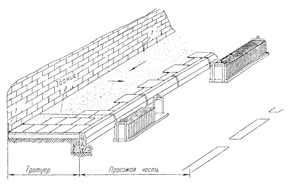 Примечание. Магистральные улицы районного значения, жилые улицы и внутриквартальные дороги следует строить преимущественно по двухстадийному принципу. На 1-й стадии они должны обеспечивать проезд построечного транспорта. 1.6. Стадийность строительства дорог: магистральные и жилые улицы, временные дороги и часть специально запроектированных постоянных дорог на 1 стадии используют для проезда построечного транспорта и тяжелых строительных машин в процессе проведения работ по инженерному благоустройству и застройке района; по окончании застройки временные дороги демонтируют. На 2-й стадии, после окончания всех строительных работ по возведению зданий, постоянные внутриквартальные дороги используют для пропуска транспорта, обслуживающего жителей района. 1.7. На первой стадии работ устраивают: - водостоки и инженерные коммуникации; - вертикальную планировку; - земляное полотно; - подстилающий слой из песка или других материалов; - технологический и конструктивный слои; - основание из уплотняемых щебеночных смесей; - основания из монолитного бетона или сборных железобетонных плит, которые в период застройки района (за исключением основания из бетона марки 200) служат покрытием; - асфальтобетонное покрытие (нижний слой трехслойного покрытия), укладываемое на цементобетонное основание марки М200 (рис. 1.1); - грунтовые обочины шириной не менее 1 м; - организованные въезды на проезжую часть из железобетонных плит, уложенных заподлицо с поверхностью покрытия. 1.8. Вторая стадия включает: - очистку и ремонт основания (покрытия); - установку бортовых камней; - устройство прослойки толщиной 4 - 5 см из мелкозернистого щебня или крупнозернистого песка; - устройство верхних слоев покрытия из асфальтобетона или бетона; - строительство тротуаров; - оборудование улиц знаками и линиями регулирования движения транспорта и пешеходов. По окончании застройки района временные дороги из железобетонных плит должны демонтироваться и использоваться повторно на других объектах. Непосредственно перед сдачей объектов в эксплуатацию на территориях детских садов, школ, больниц, жилых зданий устраиваются постоянные дороги (рис. 1.2).