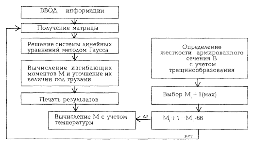 где Крп - коэффициент роста прочности бетона (п. 2.15); Ку - коэффициент усталости материала (п. 2.15), определенный от многократного воздействия нормативных нагрузок. 8. Проверку прочности дискретных слоев основания сдвигающим усилием следует проводить согласно ВСН 197-83 (24). Расчетным случаем является проезд построечного транспорта по нижнему слою основания из цементобетона, цементогрунта или щебня. 9. Учет несущей способности асфальтобетонного покрытия при расчете дорожной одежды по прочности и выносливости проводят по методике, изложенной в инструкции [19]. 10. Расчет дорожной одежды и ее элементов следует проводить для всех стадий строительства и эксплуатации. Основными расчетными случаями являются: - работа одежды на 1-й стадии эксплуатации на воздействие построечного транспорта в период застройки района; - работа одежды на 2-й стадии на воздействие городского транспорта. Кроме этого, в соответствии с принятой организацией строительства улицы, следует проводить проверочные расчеты прочности всех слоев на единичное воздействие транспорта в период строительства дорожной одежды. ПРИЛОЖЕНИЕ 2БЛОК-СХЕМА ОПРЕДЕЛЕНИЯ ИЗГИБАЮЩИХ МОМЕНТОВ В ПЛИТАХ ЖЕСТКИХ ПОКРЫТИЙ ОТ СОВМЕСТНОГО ВОЗДЕЙСТВИЯ АВТОМОБИЛЬНОЙ НАГРУЗКИ И ТЕМПЕРАТУРЫ.Наряду с широко применяемыми приближенными методами определения в плитах величин расчетных усилий, которые сводятся в основном к определению изгибающих моментов под грузом, приложенным в центре или на краю плиты, как показали проведенные в НИИМосстрое исследования, хорошие результаты дает расчет, основанный на применении метода конечных разностей и винклеровского упругого основания с использованием ЭВМ*). Данный метод позволяет рассчитывать плиты любой конфигурации жесткости (в том числе с учетом трещинообразования) и размеров на упругом основании с одним коэффициентом постели от любых произвольно приложенных одиночных или комбинированных нагрузок с учетом кручения и соблюдением всех граничных условий. Методика такого расчета реализована для ЭВМ на языке «Фортран» по следующей блок-схеме. *) Городецкий Л. В, Расчет бетонных конструкций городских улиц и дорог. -Науч. тр. /НИИМосстрой Главмосстроя, 1965. Совершенствование технологии строительства городских дорог.