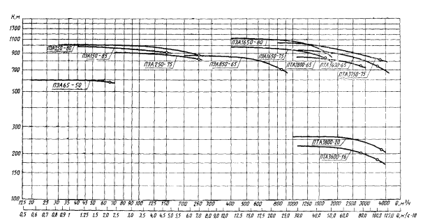 (Измененная редакция, Изм. № 2). Примечания: 1. Исключен, Изм. № 2.. 2. В условном обозначения насосов значения давления в кгс/см2 округлены. Рабочие части характеристик Q - H Черт. 1. 1.2. Насосы должны иметь постоянно падающую напорную характеристику в интервале подач от 25 до 110 % номинальной. При этом максимальный напор не должен превышать значение номинального напора более чем на 30 % для насосов с подачей 0,236 м3/с (850 м3/ч) и выше более чем на 18 % для остальных насосов. Пример условного обозначения питательного насоса для АЭС с приводом от электродвигателя, подачей 0,236 м3/с (850 м3/ч) и давлением 6,34 МПа (64,6 кгс/см2): Насос ПЭА 850-65 ГОСТ 24464-80 То же, с приводом от паровой турбины, подачей 1,056 м3/с (3800 м3/ч) и давлением 1,90 МПа (19,4 кгс/см2) Насос ПТА 3800-20 ГОСТ 24464-80 При модернизации насосов (или совершенствовании конструкции без изменения подачи и напора) в обозначение типоразмера через тире следует вводить цифры, указывающие порядковый номер модернизации по системе нумерации предприятия-изготовителя. 2. ТЕХНИЧЕСКИЕ ТРЕБОВАНИЯ2.1. Насосы должны изготовляться в соответствии с требованиями настоящего стандарта и технических условий на насосы конкретных типоразмеров по рабочим чертежам, утвержденным в установленном порядке. 2.2. Корпуса насосов должны соответствовать требованиям «Правил устройства и безопасной эксплуатации оборудования атомных электростанций, опытных и исследовательских ядерных реакторов и установок», утвержденных Госгортехнадзором СССР и Госкомитетом по использованию атомной энергии СССР. 2.3. Насосы должны изготовляться в климатическом исполнении УХЛ категории размещения 4 по ГОСТ 15150-69. 2.4. Группа надежности насосов - I по ГОСТ 6134-71. 2.5. В насосах или на их плитах (рамах) должны быть предусмотрены регулирующие устройства для выверки их положения на фундаменте и места для установки уровня. Места для установки уровня должны быть указаны на монтажном чертеже. 2.6. Суммарные внешние утечки жидкости через концевые уплотнения ротора насоса не должны превышать 0,1 м3/ч. Отвод утечек должен быть организованным. 2.7. Наработка на отказ основных и предвключенных насосов - не менее 6300 ч. Установленный ресурс до капитального ремонта основных и предвключенных насосов - не менее 25000 ч. Назначенный срок службы аварийных насосов до капитального ремонта - не менее 5 лет. Вероятность безотказной работы аварийных насосов за 1000 ч - не менее 0,95. Установленный срок службы насосов до списания - 30 лет. Наработка на отказ насосов ПЭА 850-65 и ПЭА 1650-80 - не менее 8000 ч. Критерии отказов и предельных состояний насосов должны быть указаны в технических условиях на конкретную продукцию. (Измененная редакция, Изм. № 2). 2.8, 2.9. (Исключены, Изм. № 2). 2.10. Необходимое снижение напора насосов при эксплуатации достигается обточкой рабочих колес по наружному диаметру до 5 % его первоначального значения в соответствии с эксплуатационной документацией. 2.11. Конструкция насосов должна быть рассчитана для установки их на АЭС в сейсмических районах. 2.12. Показатели ремонтопригодности насосов должны быть указаны в технических условиях на насос конкретного типоразмера, 2.13. Среднее квадратическое значение виброскорости, измеренное на корпусах подшипников, не должно быть более 7 мм/с. 2.14. Наружные поверхности насоса должны иметь стойкие лакокрасочные покрытия. Класс покрытия насоса не ниже - VI, усл