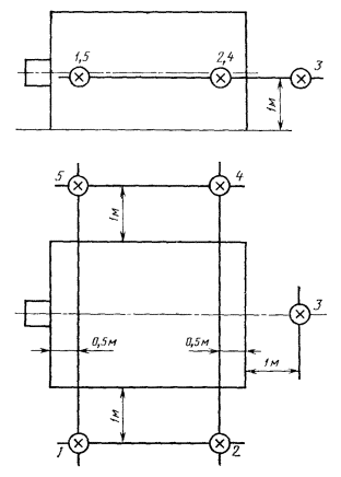 Примечания: 1. Значения уровней звукового давления и уровней звука в контрольных точках, не указанных в табл. 3, будут внесены в таблицу после освоения насосов соответствующих типоразмеров. 2. Координаты контрольных измерительных точек приведены на черт. 2. (Введено дополнительно, Изм. № 2). Координаты контрольных точек для измерения уровней звука и звукового давления насосов с приводом от паровой турбины Черт. 2. 4. КОМПЛЕКТНОСТЬ4.1. Насосы должны быть укомплектованы: электродвигателем (для насосов с приводом от электродвигателя); соединительной муфтой; запасными частями, специальным инструментом и приспособлениями в соответствии с ведомостью ЗИП; устройствами автоматики и КИП; вспомогательным оборудованием в соответствии с техническими условиями на насосы конкретных типоразмеров. 4.2. К насосам должна быть приложена эксплуатационная документация по ГОСТ 2.601-68 в соответствии с техническими условиями на насосы конкретных типоразмеров. 5. ПРАВИЛА ПРИЕМКИ5.1. Правила приемки - по ГОСТ 23104-78. 6. МЕТОДЫ ИСПЫТАНИЙ6.1. Методы испытаний - по ГОСТ 23104-78. 6.2. Измерение параметров вибрации - по ГОСТ 13731-68, воздушного шума - по ГОСТ 23941 и ГОСТ 12.1.028-80 или ГОСТ 12.1.026-80. (Введен дополнительно, Изм. № 2). 7. МАРКИРОВКА, УПАКОВКА, ТРАНСПОРТИРОВАНИЕ И ХРАНЕНИЕ7.1. Маркировка, упаковка, транспортирование и хранение - по ГОСТ 23104-78. 8. ГАРАНТИИ ИЗГОТОВИТЕЛЯ8.1. Изготовитель должен гарантировать соответствие насосов требованиям настоящего стандарта при соблюдении правил транспортирования, хранения, монтажа и эксплуатации установленных настоящим стандартом и эксплуатационной документацией. 8.2. Гарантийный срок эксплуатации насосов с учетом использования запасных деталей - 24 мес со дня ввода насосов в эксплуатацию. СОДЕРЖАНИЕ