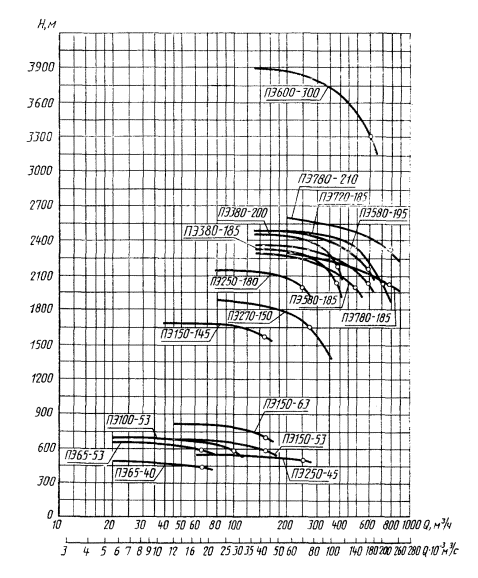 Дата введения 01.01.78 1. Настоящий стандарт распространяется на многоступенчатые, секционные, горизонтальные питательные центробежные насосы (ПЭ) с приводом от электродвигателя с синхронной частотой вращения 50 с-1 (3000 об/мин), предназначенные для питания водой стационарных паровых котлов с абсолютным давлением пара 3,9; 9,8; 13,7; 25 МПа (40, 100, 140, 255 кгс/см2). 2. Вода должна иметь водородный показатель рН 7 - 9,2, температуру не более 438 К (165 °С) и не содержать твердых частиц. 3. Типоразмеры и основные параметры насосов должны соответствовать указанным в таблице. (Измененная редакция, Изм. № 1). 4. Для насосов с подачей 0,105 м3/с (380 м3/ч) и выше допускается применять гидромуфты. Для насоса типоразмера ПЭ 600-300 должны применяться гидромуфта и мультипликатор. 5. Рабочие части характеристик насосов Q - Н должны соответствовать указанным на чертеже. 6. Насосы должны иметь постоянную падающую напорную характеристику в интервале подач от 30% до номинальной. При этом максимальный напор не должен превышать величину напора при номинальной подаче более чем на 22 %. 7. Насосы с подачей 0,105 м3/с (380 м3/ч) и выше, а также насос типоразмера ПЭ 250-180 должны допускать отбор воды от промежуточной ступени до 10 %. от номинальной подачи с давлением 3,9 - 7,4 МПа (40 - 75 кгс/см2) при работе в номинальном режиме. В интервале подач от 30 % до номинальной значения давлений отбора должны быть выше указанного не более чем на 22 %. Примечание. Давление отбора указано без учета давления на входе в насос.