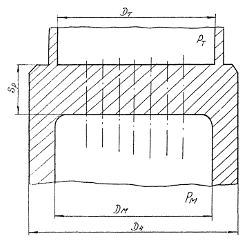 Дата введения 01.01.89 Настоящий руководящий документ распространяется на кожухотрубчатые теплообменные аппараты, работающие под действием внутреннего давления свыше 10 МПа до 100 МПа, применяемые в химической, нефтехимической промышленности, производстве минеральных удобрений и других смежных отраслях промышленности и отвечающие требованиям ГОСТ 11879-81, ОСТ 26-01-221-86, ОСТ 26-291-87, ОСТ 26-1046-87, ГОСТ 14249-80. Настоящий руководящий документ устанавливает нормы и методы расчета толщины трубных решеток (из условия прочности) кожухотрубчатых теплообменных аппаратов с U-образными трубами, с компенсаторами на трубах, с компенсатором на корпусе межтрубного пространства аппарата. Руководящий документ не распространяется на теплообменные аппараты высокого давления, (свыше 10 до 100 МПа), трубные решетки которых спроектированы до 01.01.89 г. и изготовлены до 01.01.91 г. 1. ОБЩИЕ ПОЛОЖЕНИЯ1.1. Условные обозначения C - сумма прибавок к расчетной толщине трубной решетки, мм; Dт - внутренний диаметр камеры трубного пространства аппарата, мм; Dм - внутренний диаметр камеры межтрубного пространства аппарата, мм; Dк - наружный диаметр компенсатора, мм; Dо - диаметр перфорированной части трубной решетки, мм; D3 - диаметр окружности центров шпилек, мм; D4 - наружный диаметр трубной решетки, мм; DR - расчетный диаметр уплотнения, мм; dp - диаметр отверстия в решетке, мм; dт - наружный диаметр трубы, ми; dВ - наружный диаметр резьбы шпильки, мм; FQ - осевая сила от действия давления среды на крышку, Н; FB - расчетное усилие, действующее на шпильки при расчетном давлении, Н; i - количество труб; Kp - поправочный коэффициент; N - число циклов нагружения; Nт - осевое усилие в трубе, Н; n - количество отверстий в наиболее ослабленном сечении решетки; Pm - расчетное давление в камере трубного пространства аппарата, МПа; Рм - расчетное давление в камере межтрубного пространства аппарата, МПа; R - расстояние от оси аппарата до оси наиболее удаленной трубы, мм; SPR - расчетная толщина трубной решетки, мм; Sp - исполнительная толщина трубной решетки, мм; tp - шаг расположения отверстий в решетке, мм; bp - коэффициент толстостенности трубной решетки; d - высота сварного шва в месте приварки трубы к решетке, мм; [s]p- допускаемое напряжение для материала трубной решетки при расчетной температуре, МПа; [s]т - допускаемое напряжение для материала труб, МПа. 1.2. Материалы и требования к конструкции и изготовлению. Материалы, применяемые для изготовления трубных решеток теплообменных аппаратов высокого давления, должны удовлетворять требованиям ОСТ 26-01-135-81. 1.3. Рабочее, расчетное, пробное давления, давление опрессовки. Рабочее, расчетное, пробное избыточные давления и давление опрессовки определяются в соответствии с ГОСТ 14249-80. Расчетная температура трубных решеток определяется по ГОСТ 14249-80. 1.5. Допускаемое напряжение, коэффициенты запаса прочности. 1.5.1. Допускаемое напряжение и коэффициенты запаса прочности принимаются по ГОСТ 25215-82. Прочностные характеристики материала трубной решетки принимаются по ОСТ 26-01-135-81. 1.5.2. Проверку прочности трубных решеток на пробное давление необходимо производить в соответствии с ГОСТ 25215-82 и по формулам (1), (2), (6), (7), (12), (13), (15), (16) настоящего руководящего документа. 1.5.3. При гидравлическом испытании камеры теплообменного аппарата с многослойным корпусом повышенным давлением опрессовки необходимо п