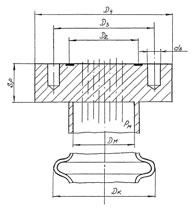 2.3.3. Осевое усилие в трубе для теплообменного аппарата с компенсатором на корпусе межтрубного пространства следует определять по формуле Трубная решетка, жестко связанная с корпусом камеры высокого давления (Рт > Pм). Черт. 1 Трубная решетка, жестко связанная с корпусом камеры высокого давления (Рт < Pм). Черт. 2 Коэффициент Kp Черт. 3 3. РАСЧЕТ ТОЛЩИНЫ ТРУБНОЙ РЕШЕТКИ С РАЗЪЕМНЫМ СОЕДИНЕНИЕМ РЕШЕТКИ С КОРПУСОМ КАМЕРЫ ВЫСОКОГО ДАВЛЕНИЯ3.1. Теплообменные аппараты с U-образными трубами или компенсаторами на трубах (Рт > Pм). 3.1.1. Толщину трубной решетки следует рассчитывать по формулам: 3.1.2. Осевая сила FQ и расчетное усилие определяются по ГОСТ 26303-84. 3.1.3. Диаметр перфорированной части трубной решетки Do следует определять по формуле (3). 3.1.4. Величину коэффициента Kp в зависимости от толстостенности трубной решетки bp следует определять в соответствии с черт. 3. 3.1.5. Величину коэффициента толстостенности трубной решетки следует определять по формуле 3.1.6. Расчетную толщину трубной решетки следует принимать наибольшей из двух значений SPR, определенных по формулам (12), (13). 3.1.7. Исполнительная толщина трубной решетки должна удовлетворять условию (5) и требованию п. 2.1.6. 3.1.8. Проверка прочности крепления труб в решетке должна проводиться по п. 2.3. 3.2. Теплообменные аппараты с компенсатором на корпусе межтрубного пространства в соответствии с черт. 4. 3.2.1. Толщину трубной решетки следует рассчитывать по формулам: 3.2.2. Диаметр перфорированной части трубной решетки следует определять по формуле (3). 3.2.3. Осевая сила FQ и расчетное усилие FB определяются по ГОСТ 26303-84. 3.2.4. Величину коэффициента Kp следует определять в соответствии с черт. 3. 3.2.5. Величину коэффициента толстостенности трубной решетки следует определять по формуле 3.2.6. Расчетную толщину трубной решетки следует принимать наибольшей из двух значений, определенных по формулам (15), (16). 3.2.7. Исполнительная толщина трубной решетки должна удовлетворять условию (5) и требованию п. 2.1.6. 3.2.8. Проверка прочности крепления труб в решетке должна проводиться по п. 2.3. Трубная решетка с разъемным соединением корпуса камеры высокого давления Черт. 4 ИНФОРМАЦИОННЫЕ ДАННЫЕ УТВЕРЖДЕН И ВВЕДЕН В ДЕЙСТВИЕ Министерством химического и нефтяного машиностроения, УкрНИИхиммаш ИСПОЛНИТЕЛИ В. И. Лившиц, канд. техн. наук; В. Г. Татаринов, канд. техн. наук; (руководитель темы); В. П. Дорохов, канд. техн. наук; Л. М. Лобова. ВВЕДЕН впервые. Срок первой проверки - 1993г. Периодичность проверки - четыре года. ССЫЛОЧНЫЕ НОРМАТИВНО-ТЕХНИЧЕСКИЕ ДОКУМЕНТЫ