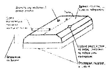 3. ПЛИТЫ ЛЕНТОЧНЫХ ФУНДАМЕНТОВ.3.1 Контролируемые параметры и средства контроля Входной контроль 1. Качество плит железобетонных ленточных фундаментов, поставляемых на строительную площадку, должно соответствовать требованиям ГОСТ 13015.0-83 "Конструкции и изделия бетонные и железобетонные сборные" и ГОСТ 13580-85 "Плиты железобетонные ленточных фундаментов". 2. Значения действительных отклонений геометрических параметров плиты не должны превышать предельных, указанных в таблице 1. Рис. 1 Параметры, контролируемые при входном контроле