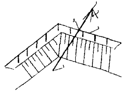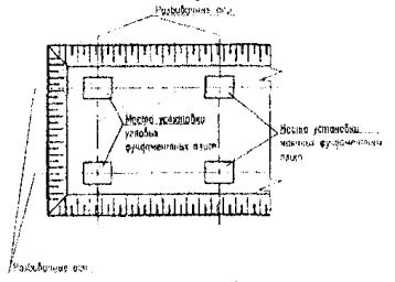 1 - осевой знак 2 - обноска 3 - риска на обноске 4 - штырь, закрепляющий ось здания Рис. 1 Закрепление разбивочных осей на обноске