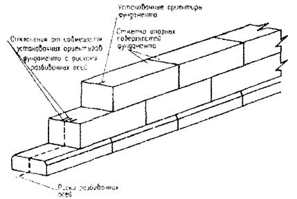 12. ОБЯЗАТЕЛЬНЫЕ ОРГАНИЗАЦИОННО-ТЕХНОЛОГИЧЕСКИЕ ПРАВИЛА1. Установка блоков фундаментов стаканного типа производится относительно разбивочных осей по двум взаимно перпендикулярным направлениям, с совмещением осевых рисок фундаментов с ориентирами, закрепленными в основании, и контролем правильности установки геодезическими приборами. Фундаментные блоки устанавливаются на выровненный до проектной отметки слой песка. Предельное отклонение отметки выравнивающего слоя песка до проектной не должно превышать минус 15 мм. Плановое и высотное положение фундаментов определяется от знаков внутренней разбивочной оси здания или ориентиров, которые использовались при выполнении работ. Установка блоков фундаментов на покрытые водой или снегом основания не допускается. Стаканы фундаментов и опорные поверхности очищаются от загрязнения. Фундаменты хранятся в штабелях, рассортированные по маркам и партиям, высота штабеля фундамента не должна превышать двух рядов. При хранении каждый фундамент укладывается на деревянные прокладки и подкладки. Толщина прокладок должна быть не менее 100 мм, подкладок не менее 30 мм. Прокладки и подкладки располагаются в штабеле по одной вертикали. Подкладки под нижний ряд фундаментов укладываются по плотному, тщательно выровненному основанию. При транспортировании фундаменты размещаются в один ряд на деревянных подкладках с надежным закреплением, предохраняющим их от смещения во время движения. 2. Установка плит ленточных фундаментов производится с установки маячных плит в углах здания и на пересечение осей. Маячные плиты устанавливаются с совмещением их осевых рисок с рисками разбивочных осей по двум взаимно перпендикулярным направлениям. К установке рядовых плит следует приступать после выверки положения маячных плит в плане и по высоте, ориентируя их по причалке, закрепленной по внешней грани смонтированных маячных плит. Плиты фундаментов устанавливаются на выровненный до проектной отметки слой песка. Установка плит на покрытые водой или снегом основания не допускается. Швы между плитами заполняются раствором и расшиваются. Марка раствора для замоноличивания швов указывается в проекте. Стыкуемые поверхности должны быть очищены от мусора и грязи. Замоноличивание швов выполняется после проверки правильности установки плит. Плановое и высотное положение фундаментных плит определяется от знаков внутренней разбивочной оси здания или ориентиров, которые использовались при выполнении работ. Плиты транспортируются и хранятся в горизонтальном положении в штабелях. Высота штабеля не должна превышать 2 м. Подкладки под плитами и прокладки между ними в штабеле располагаются в поперечном направлении плит (в направлении ширины) на расстояниях от торцов плит, мм; 750 - при длине плиты 2980 600 - при длине плиты 2380 300 - при длине плиты 1180 200 - при длине плиты 780 Высота штабеля при транспортировании устанавливается в зависимости от грузоподъемности транспортных средств и допускаемых габаритов погрузки, но не более высоты штабеля при хранении. Площадка складирования должна иметь плотную выровненную поверхность с небольшим уклоном для водоотвода. 3. Установка блоков фундаментов для стен подвалов производится с установки маячных блоков в углах здания и на пересечении осей. Маячные блоки устанавлива