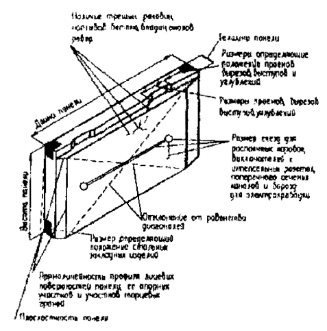 Примечание: ГОСТ 12504-80 устанавливает требования для панелей: А4 - лицевые; А7 - боковые, невидимые в условиях эксплуатации; А2 и А3 - лицевые, подготовленные под окраску; А5 - лицевые, подготовленные под облицовку керамическими и другими плитками по слою раствора; А6 - лицевые, к которым не предъявляется требование по качеству отделки. На лицевой поверхности панелей не допускаются жировые и ржавые пятна. В бетоне панелей, поставляемых потребителю, не должно быть трещин, за исключением местных, поверхностных усадочных и других технологических трещин шириной не более 0,2 мм, а в панелях высшей категории качества - не более 0,1 мм Открытые поверхности стальных закладных изделий, выпуски арматуры и монтажные петли не должны иметь наплывов бетона. 4. Каждая поставляемая предприятием-изготовителем партия панелей, часть партии, группа панелей из разных партий или отдельные панели, принимаемые и поставляемые поштучно, должны сопровождаться документом о качестве (сертификат и др.). 5. На торцевой вертикальной грани каждой панели, поставляемой потребителю, должны быть нанесены несмываемой краской при помощи трафарета или штампа следующие маркировочные знаки: товарный знак предприятия-изготовителя или его краткое наименование; марка панели; дата изготовления панели; штамп технического контроля; номинальная масса панели из тяжелого бетона и бетона на пористых заполнителях или номинальная отпускная масса панели из силикатного и ячеистого бетонов; монтажные знаки. Допускается наносить маркировочные знаки на лицевую поверхность панели вблизи ее торцевой вертикальной грани краской, не снижающей качество последующей отделки панелей. Потребитель имеет право проводить входной контроль качества панелей на строительной площадке, применяя при этом правила приемки и методы отбора образцов для контроля, установленные ГОСТ 12504-80. Допускается по соглашению потребителя с изготовителем проводить приемку панелей на предприятии-изготовителе или в другом согласованном месте. Показатели качества, которые не могут быть проверены на готовых панелях, потребитель имеет право проверить по данным журналов ОТК, заводской лаборатории или другой документации завода-изготовителя. По требованию потребителя завод-изготовитель обязан сообщить ему эти данные в течение 15 суток после получения соответствующего запроса от потребителя. Операционный контроль 7. Параметры, подлежащие контролю, и необходимые для операционного контроля средства измерений приведены в таблице 3. Таблица 3
