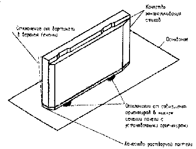 Приемочный контроль 7. Приемочный контроль должен включать проверку соответствия предельных отклонений установленной панели требованиям таблицы 3 настоящего "Регламента", контроль качества сварных соединений, антикоррозионного покрытия и замоноличивания стыков требованиям СНиП 3.03.01-87 "Несущие и ограждающие конструкции", а также полноту исполнительной документации и ведения журнала работ. 6.2 РЕГЛАМЕНТ ОПЕРАЦИОННОГО КОНТРОЛЯ КАЧЕСТВА МОНТАЖА ВНУТРЕННИХ СТЕНОВЫХ ПАНЕЛЕЙ ПОДВАЛЬНОГО И ЦОКОЛЬНОГО ЭТАЖЕЙ