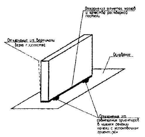 Рис. 2 Параметры, контролируемые при операционном контроле Входной контроль 1. Качество блоков бетонных для стен подвалов должно соответствовать требованиям ГОСТ 13579-78 "Блоки бетонные для стен подвалов" и ГОСТ 13015.0-83 "Конструкции и изделия бетонные и железобетонные сборные". 2. Отклонение проектных размеров блоков не должны превышать, мм: по длине ±13 по ширине и высоте ±8 по размерам вырезов ±5 Отклонение от прямолинейности профиля поверхностей блока не должно превышать 3 мм на всю длину и ширину блока. 3. Размеры раковин, местных наплывов и впадин на бетонной поверхности и околов бетона ребер блоков не должны превышать значений, указанных в таблице 1. Таблица 1 мм