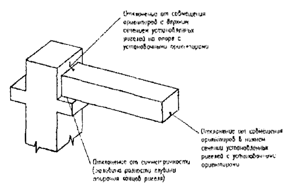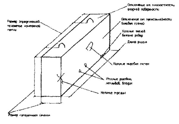 Рис. 2 Параметры, контролируемые при операционном контроле Входной контроль 1. Качество железобетонных ригелей для каркасов многоэтажных общественных зданий, поставляемых на строительную площадку, должно соответствовать требованиям ГОСТ 18980-90 "Ригели железобетонные для многоэтажных зданий" и ГОСТ 13015.0-83 "Конструкции и изделия бетонные и железобетонные сборные". 2. Значения действительных отклонений геометрических параметров ригелей не должны превышать предельных, указанных в таблице 1. Таблица 1 мм
