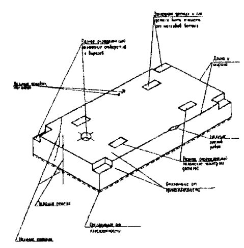 Примечание: По качеству поверхностей и внешнему виду для плит устанавливаются категории качества: А3 - нижней (потолочной); А7 - верхней и боковых. По согласованию изготовителя с потребителем плит могут быть установлены вместо указанных следующие категории поверхностей: А2 - нижняя (потолочная), подготовленная под окраску; А4 - то же, подготовленная под оклейку обоями или декоративную отделку пастообразными составами и верхняя, подготовленная под покрытия линолеума; А6 - нижняя (потолочная), к которой не предъявляют требований по качеству отделки. На лицевых поверхностях плит не допускаются жировые и ржавые пятна. 4. В бетоне плит, поставляемых потребителю, трещины не допускаются, за исключением усадочных и других поверхностных технологических трещин шириной не более 0,3 мм на верхней поверхности плит и не более 0,2 мм - на боковых и нижней поверхностях плит. Обнажение арматуры не допускается, за исключением выпусков арматуры или концов напрягаемой арматуры, которые не должны выступать за торцовые поверхности плит более чем на 10 мм и должны быть защищены слоем цементно-песчаного раствора или битумным лаком. 5. Каждая поставляемая предприятием-изготовителем партия плит, часть партии, группа плит из разных партий или отдельные плиты, принимаемые и поставляемые поштучно, должны сопровождаться документом о качестве (сертификат и пр.). 6. На боковых гранях или на верхней поверхности каждой плиты, поставляемой потребителю, должны быть нанесены несмываемой краской при помощи трафарета или штампа следующие маркировочные знаки: марка плиты; товарный знак или краткое наименование предприятия-изготовителя; штамп технического контроля; дата изготовления плиты; величина массы плиты; монтажные знаки. 7. Потребитель имеет право производить контроль качества плит на строительной площадке или в другом согласованном месте по показателям, которые могут быть проверены на готовых плитах с учетом правил приемки, установленных соответствующим стандартом на эти плиты. Показатели качества, которые не могут быть проверены на готовых плитах, потребитель имеет право проверить по данным журналов ОТК, заводской лаборатории или другой документации завода-изготовителя. По требованию потребителя завод-изготовитель обязан сообщить ему эти данные в течение 15 суток после получения соответствующего запроса от потребителя. Операционный контроль 8. Параметры, подлежащие контролю, и необходимые для операционного контроля средства измерения приведены в таблице 3. Таблица 3
