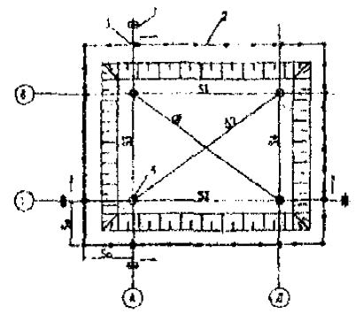 1 - обноска котлована 2 - проволока по оси торцевой стены 3 - проволока по оси продольной стены 4 - ось фундамента 5 - риска на обноске 6 - металлический штырь, закрепляющий ось здания Рис. 3 Вынесение осей здания на дно котлована с помощью нитяных отвесов Точность разбивочных работ Таблица 1
