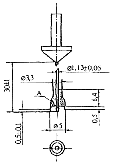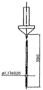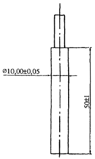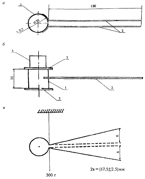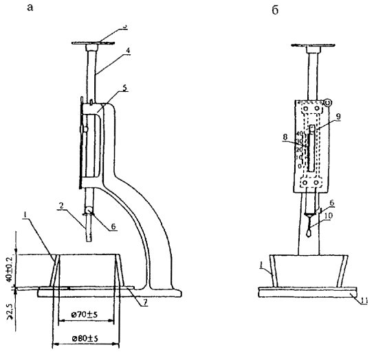 где тц - масса навески цемента, г; V - объем керосина, вытесненного цементом, см3. Рисунок 1 - Прибор Ле Шателье За плотность цемента принимают среднеарифметическое значение результатов двух определений, расхождение между которыми не должно превышать 0,02 г/см3. Результат вычисления округляют до 0,01 г/см3. Допускается использование других методов определения плотности, погрешность которых не превышает требования настоящего стандарта. 5.2.2.3 Расчет массы навески цемента с учетом плотности, определенной по 5.2.2.2, и проведение испытаний для определения удельной поверхности выполняют в соответствии с инструкцией к прибору. Пробу цемента для испытаний готовят по 5.1.2.1. 5.2.2.4 За удельную поверхность принимают среднеарифметическое значение результатов двух определений, расхождение между которыми не должно быть более 1 % среднеарифметического значения. Результат вычисления округляют до 1 м2/кг (10 см2/г). 6 Определение сроков схватыванияПрибор Вика в комплекте с пестиком, иглами (длинной и короткой), кольцом и пластинкой (рисунок 2). Прибор Вика состоит из цилиндрического металлического стержня, который свободно перемещается в обойме станины в вертикальном направлении и может фиксироваться на требуемой высоте с помощью стопорного устройства. На стержне имеется указатель для отсчета перемещения его относительно шкалы с ценой деления 1 мм. Пестик должен быть изготовлен из нержавеющей стали и иметь полированную поверхность. Размеры рабочей части пестика должны соответствовать указанным на рисунке 3. Иглы должны быть изготовлены из стальной нержавеющей проволоки с полированной поверхностью и не должны иметь искривлений. Короткая игла для определения конца схватывания должна быть снабжена кольцеобразной насадкой с наклонным каналом для выхода воздуха. Размеры рабочей части игл должны соответствовать указанным на рисунках 4 и 5. Общая масса перемещающейся части прибора Вика должна быть (300±1) г и сохраняется взаимной перестановкой пестика и игл либо с помощью дополнительного пригруза, закрепляемого в верхнем конце стержня прибора. Для определения сроков схватывания могут применяться автоматизированные приборы при условии получения тех же результатов, как при использовании прибора Вика. При этом определения выполняют в соответствии с инструкцией к прибору. а - положение кольца при определении нормальной