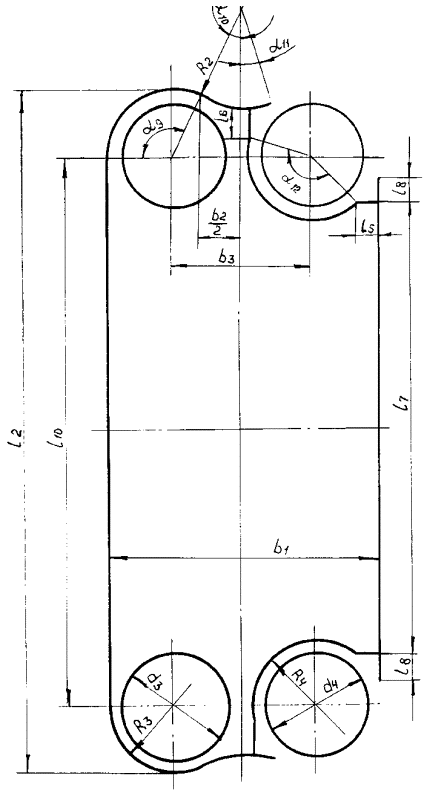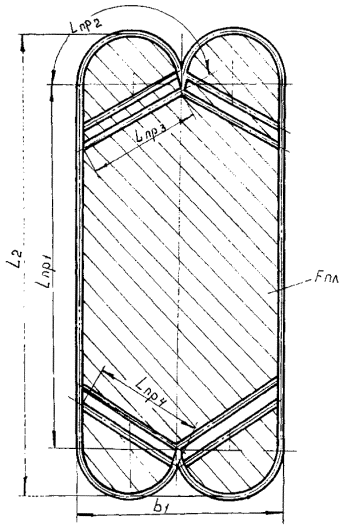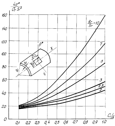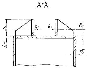 q1, q2, q(1), q(2) - давления первого, второго теплоносителей и давление в концевых камерах, примыкающих к плитам; n1, n2 - число камер с первым и вторым теплоносителем. Часть контура средней линии концевой прокладки разборного теплообменного аппарата Черт. 38 Контур средней линии прокладки пластины полуразборного теплообменного аппарата Черт. 39 Пластина неразборного теплообменного аппарата Черт. 40 Таблица 3 7. КОЛЛЕКТОРЫ7.1. Коллекторы под действием внутреннего давления 7.1.1. Расчетные схемы представлены на черт. 41, 42. 7.1.2. Расчетные формулы применимы при условии r/S17³5. 7.1.3. Цилиндрическая панель с боковыми стенками 7.1.3.1. Расчетная нагрузка от давления среды, приходящаяся на панель и боковые стенки