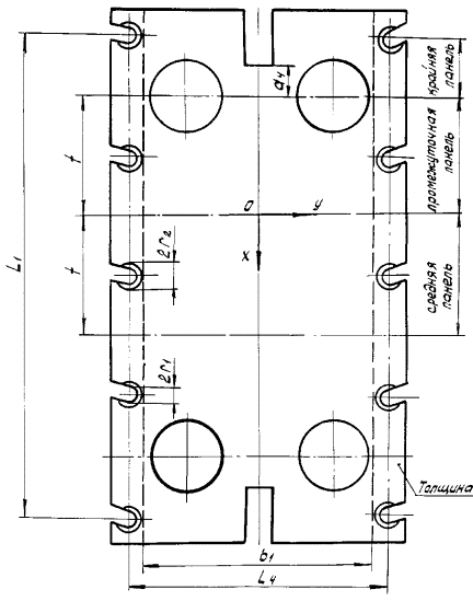 выдерживать соотношение 2.3.3.2. Верхние (нижние) стяжки можно располагать на расстоянии (определяемом условиями прочности), меньшем L4, так как они находятся в зоне плиты, ослабленной вырезами. Оребренная плита Черт. 9 Панель с отверстием Черт. 10 Таблица 1