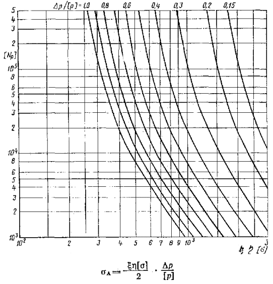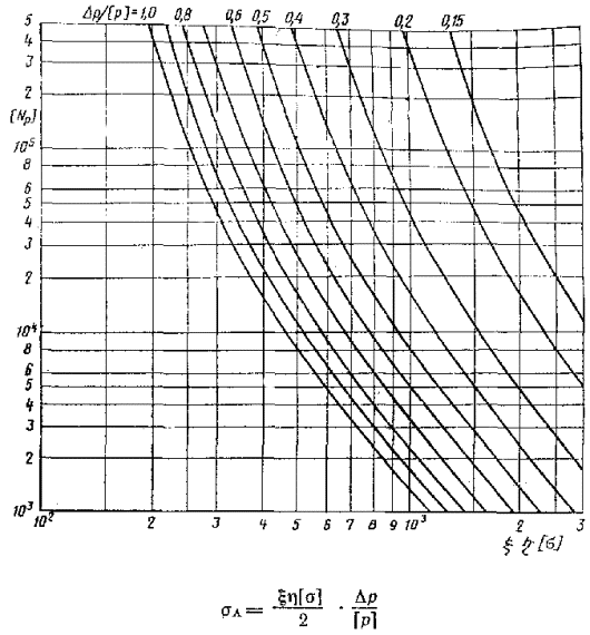 расстояние между которыми не превышает д) размахов колебаний температуры в месте соединения материалов с различными коэффициентами линейного расширения, которые не превышают 50 °С. (Измененная редакция, Изм. № 1). 2.5. Размах колебания главных нагрузок определяют на основе рабочих значений этих нагрузок. 2.6. Число циклов нагружения определяют по установленной в документации долговечности сосуда или аппарата. При отсутствии таких данных принимают долговечность 10 лет. 3. УСЛОВИЯ ПРОВЕРКИ НА МАЛОЦИКЛОВУЮ УСТАЛОСТЬ3.1. Расчет на малоцикловую усталость не проводят, если имеются положительные результаты эксплуатации аналогичного сосуда при тех же условиях работы и в течение времени не менее расчетной долговечности. 3.2. Расчет на малоцикловую усталость по разд. 4 и 5 не проводят, если для всех элементов сосуда выполняются следующие условия: 1) все изменения нагрузок, кроме давления, удовлетворяют условиям п. 2.4; 2) размах давления принимают постоянным в течение всего срока эксплуатации; 3) удовлетворяется условие Np < [Np] (1) для всех элементов сосуда. Допускаемое число циклов нагружения давлением [Np] определяют по черт. 1-3. Формулу (1) применяют на основании расчета отдельных узлов при соответствующих значениях ξ η [σ] и [р]. Допускается проводить расчет аппарата в целом при наибольших значениях ξ η [σ] и наименьшем [р]. 3.3. Если условие формулы (1) не выполняется, то проводят либо упрощенный, либо уточненный расчет на малоцикловую усталость по разд. 4 или 5. Допускается уточненный расчет не проводить, если упрощенный расчет дает положительные результаты. Допускаемое число циклов нагружения давлением для элементов сосудов и аппаратов из углеродистых сталей Черт. 1 Примечание. Номограмма построена при значениях А = 60 . 103 МПа, В = 150 МПа, t = 380 °С. Допускаемое число циклов нагружения давлением для элементов сосудов и аппаратов из низколегированных сталей