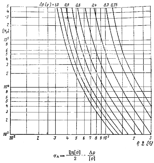 Черт. 2 Примечание. Номограмма построена при значениях А = 45 . 103 МПа, В = 230 МПа, t = 420 °С. Допускаемое число циклов нагружения давлением для элементов сосудов и аппаратов из аустенитных сталей