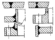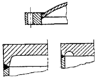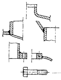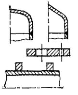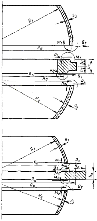 Схемы пересечения оболочек вращения различной ориентации Черт. 1 Схемы сопряжения оболочек через кольцо жесткости Черт. 2 в) вычисление упругих напряжений в крайних волокнах обечаек по линиям их сопряжения с распорным кольцом