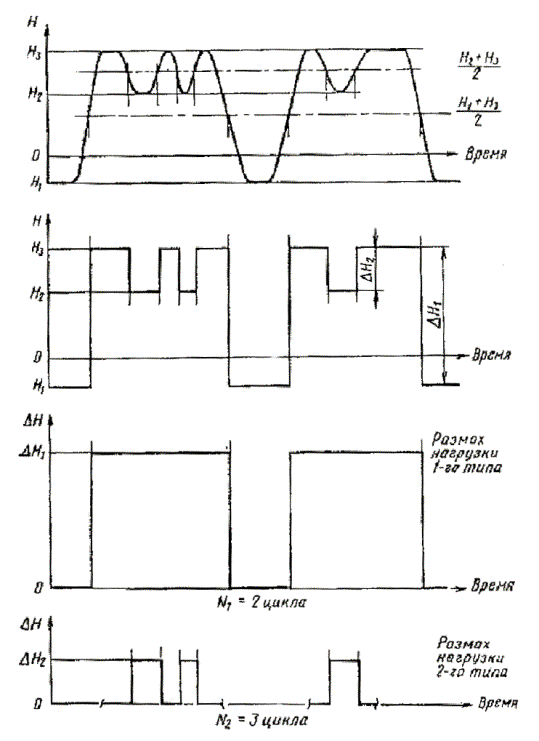 Примечание. Значение ξ действительно только в том случае, когда площадь поперечного сечения и момент сопротивления сварного соединения не меньше соответствующих значений в наиболее слабом элементе узла. (Измененная редакция, Изм. № 1). 5. УТОЧНЕННЫЙ РАСЧЕТ НА МАЛОЦИКЛОВУЮ УСТАЛОСТЬ5.1. Уточненный расчет на малоцикловую усталость основан на определении напряжений для упругого материала по теории пластин, оболочек, колец и балок: при линейном распределении напряжений по толщине стенки. При расчете определяют напряжения для проверяемого узла в нескольких точках каждого элемента на внутренней и наружной поверхностях в трех направлениях. Полученные таким образом решения для некоторых наиболее типичных узлов приведены в справочном приложении 1. 5.2. Для упрощения расчетов эпюры циклов нагружения принимают в виде прямоугольников (черт. 4), причем количество циклов определяют при постоянной нагрузке, или одна нагрузка может иметь в одном главном цикле (пуск в эксплуатацию и останов) несколько второстепенных целых циклов. 5.3. Для каждого вида нагрузки рассчитывают размах отдельных составляющих напряжений Δσх, Δσy, Δσz, Δτхy, Δτхz, Δτyz, Δσ1, Δσ2, Δσ3 как разность напряжений обоих нагруженных состояний, входящих в цикл. Таблица 2