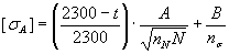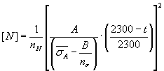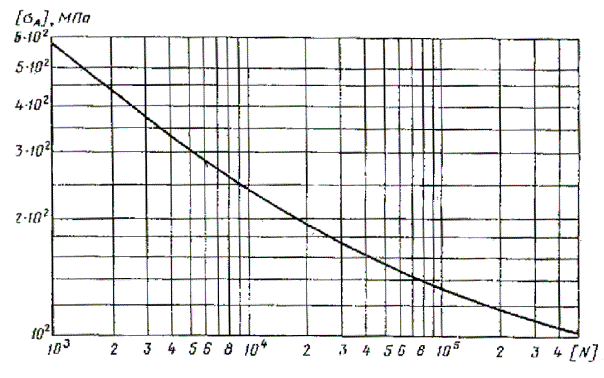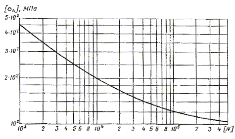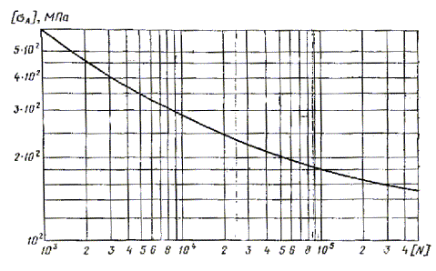 5.4. Значение эффективного коэффициента концентрации напряжения Кσ определяют по формуле Kσ = 1 + q(ασ - 1), (7) где 0 < q < 1 - коэффициент чувствительности материала к концентрации; ασ - теоретический коэффициент концентрации. Значения q и ασ определяют в зависимости от применяемых материалов и концентрации напряжений. При отсутствии точных данных Kσ = ρξ / φ, (8) где φ - коэффициент прочности сварного шва по ГОСТ 14249-89; ξ - определяют по табл. 1. ρ = 1,0 для шлифованных поверхностей и сварных швов; ρ = 1,1 для необработанных поверхностей и швов. 5.5. Для полученного значения σA по формуле (11) определяют [Nj]. 5.6. При известных значениях Nj и [Nj] для отдельных типов циклов нагружения определяют коэффициент линейного суммирования повреждений U, который должен удовлетворять условию формулы (2). 6. ОПРЕДЕЛЕНИЕ ДОПУСКАЕМОЙ АМПЛИТУДЫ НАПРЯЖЕНИЙ И ДОПУСКАЕМОГО ЧИСЛА ЦИКЛОВ НАГРУЖЕНИЯ6.1. Допускаемую амплитуду напряжений определяют по формуле (9) или графикам черт. 5-8 6.2. Допускаемое число циклов нагружения определяют по формуле (10) или графикам черт. 5-8 где Расчетная кривая усталости для углеродистых, сталей до температуры 380 °С Черт. 5 Расчетная кривая усталости для низколегированных сталей до температуры 420 °С