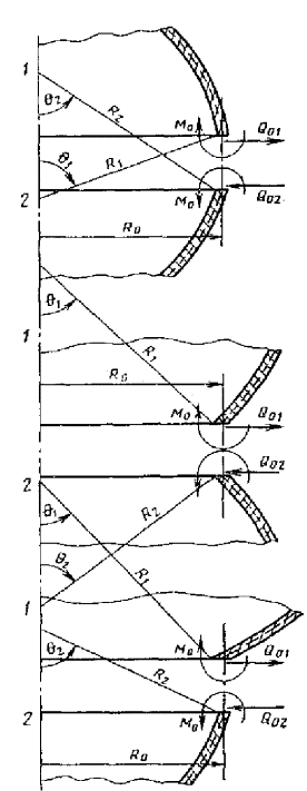 Примечание. Знак «+» в выражении для q01 соответствует верхнему положению полюса оболочки (табл. 1 настоящего приложения); (Измененная редакция, Изм. № 1). б) вычисление краевого усилия Q0i и изгибающего момента М0 (черт. 1 настоящего приложения;