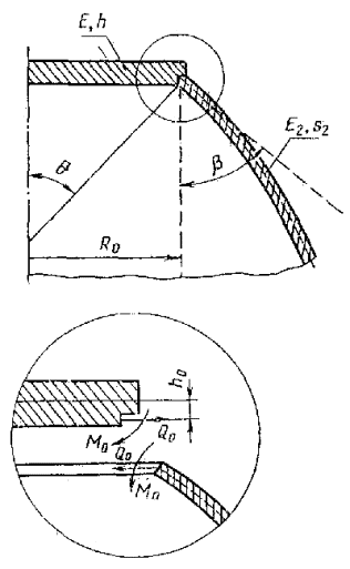 Значения коэффициентов ηx и ηφ принимают по п. 1.1. l.3. Наибольшие упругие напряжения, возникающие по действием внутреннего давления в узле сопряжения оболочки вращения с плоским днищем (черт. 3), определяют следующими вычислениями: Схема сопряжения оболочки с плоским днищем Черт. 3 а) определение вспомогательных безразмерных величин