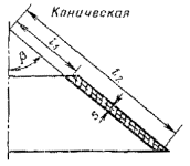 где hк и bк - размеры поперечного сечения распорного кольца (см. черт 2). Кроме того, должны удовлетворяться условия, позволяющие считать оболочки достаточно длинными (табл. 3). 1.4. Соединение конического днища через тороидальную вставку с цилиндрической обечайкой сосуда или аппарата (черт 4). Напряжения в тороидальной вставке (сечение Θ = Θ0)