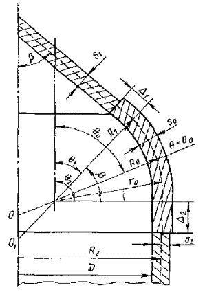 R2 = 0,5(D + s2), где r0 - радиус отбортовки; Δ1, Δ2 - длины прямолинейных участков тороидальной вставки, примыкающих к обечайкам. Расчетные зависимости применимы при выполнении условий