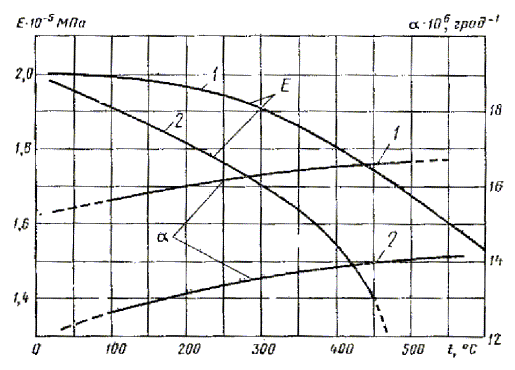 Зависимость модуля упругости* и коэффициента линейного расширения от температуры _____________ * Значения модуля упругости Е взяты в соответствии с ГОСТ 14249-80. 1 - легированные стали; 2 - углеродистые. Черт. 5