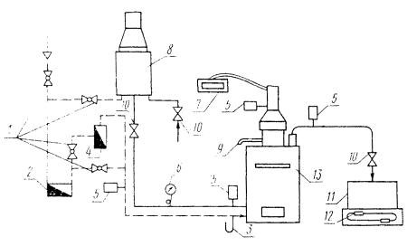 Низшую теплоту сгорания газа следует определять при помощи лабораторного калориметра или рассчитывать по составу газа, определяемому хроматографическими методами анализа. 1 - кран пробковый; 2 - счетчик газовый; 3 - мановакуумметр; 4 - счетчик газовый; 5 - термометр; 6 - манометр; 7 - тягонапоромер; 8 - водонагреватель проточный; 9 - пробоотборник; 10 - вентильный кран; 11 - сосуд для воды; 12 - весы; 13 - аппарат отопительный. Черт. 2 Определение низшей теплоты сгорания должно производиться с точностью ± 209 кДж/м3 (± 50 ккал/м3). Для расчета расхода газа следует применять газовый счетчик, обеспечивающий погрешность измерения не более 2 %. Перед замером расхода газа аппарат должен проработать не менее 5 мин. Часовой расход газа (В), приведенный к нормальным условиям, следует вычислять по формуле