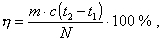 где m - часовой расход горячей воды, кг/ч; t2 - температура выходящей из аппарата воды, °С; t1 - температура входящей в аппарат воды, °С; с - теплоемкость воды, Дж/кг·°С (ккал/кг·°С); N - тепловая мощность горелки, Вт (ккал/ч). Для расчета часового расхода воды (т) следует определить на весах по ГОСТ 23676-79, ГОСТ 23711-79 с погрешностью взвешивания ± 5 г массу горячей воды, проходящей через аппарат за время не менее 5 мин. Часовой расход воды (т) должен быть определен по формуле