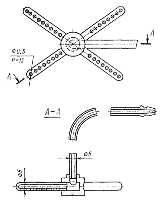 где т1 - масса воды за выбранный промежуток времени, кг; t1 - время, в течение которого определяют расход воды. 4.8. Определение содержания окиси углерода в сухих неразбавленных продуктах сгорания (п. 3 табл. 1) - по СТ СЭВ 4221-83 при номинальном давлении газа. Продукты сгорания следует отбирать пробоотборником, схема которого приведена на черт. 3. (Измененная редакция, Изм. № 5, 6). 4.9. Температура воды на выходе из аппарата (п. 4 табл. 1) и точность достижения этой температуры (п. 2.9) должны быть проверены при номинальной тепловой нагрузке. Расход воды, протекающей через аппарат, необходимо снижать до прекращения работы основной горелки или до перехода на режим пониженной тепловой мощности. Проверку следует производить пятикратно в пяти положениях, включая крайние значения диапазона регулирования. За окончательный результат должно приниматься среднее арифметическое пяти измерений. (Измененная редакция, Изм. № 5). Пробоотборник Черт. 3 4.10. Температуру продуктов сгорания на выходе из аппарата (п. 5 табл. 1) следует определять термометром с ценой деления 2,5 °С при работе аппарата на номинальной тепловой мощности и перепаде температур воды (25 ± 1) °С. Термометр должен быть установлен после стабилизатора тяги на расстоянии 200 мм от него. (Измененная редакция, Изм. № 6). 4.11. Номинальную тепловую мощность запальной горелки (п. 6 табл. 1) должны определять по методике п. 4.6 при неработающей основной горелке. 4.6 - 4.11. (Измененная редакция, Изм. № 2). 4.12. Проверку аппарата на соответствие требованиям пп. 2.2 - 2.8 следует проводить визуально. 4.13. При периодических и типовых испытаниях проверка герметичности (п. 2.10) - по СТ СЭВ 4221-83. Черт. 4. (Исключен, Изм. № 5). (Измененная редакция, Изм. № 4, 5). 4.14. Проходимость газопроводов арматуры и мест их соединений (п. 2.11) следует проверять: при приемо-сдаточных испытаниях - визуально, оценкой картины горения газа; при периодических и типовых испытаниях - определением часового расхода газа номинального давления. 4.15. Прочность и плотность теплообменника аппарата и водоведущих деталей (п. 2.12) должны проверять давлением воды или воздуха равным (100 + 20) кПа [(1 + 0,2) кгс/см2] в течение 5 мин. Теплообменник и водоведущие детали считают выдержавшими испытания, если не будет течи и падения давления. Проверку необходимо проводить при полном заполнении водой или воздухом теплообменника и водоведущих деталей. Допускается проверку теплообменника проводить до установки его в аппарат. (Измененная редакция, Изм. № 5). 4.16. Проверку аппарата на соответствие требованиям п. 2.13 - следует производить визуально при его работе на номинальном давлении газа. 4.17. (Исключен, Изм. № 5). 4.18. Время распространения пламени основной горелки по огневой поверхности (п. 2.16) следует проверять при работе аппарата на минимальном давлении газа. (Измененная редакция, Изм. № 5). 4.19. Проверку на соответствие п. 2.17a следует проводить отсчетом времени от момента зажигания запальной горелки до момента срабатывания клапана безопасности. Проверку соответствия требованиям пп. 2.17б и 2.17в следует проводить после работы аппарата на номинальном давлении не менее 5 мин отсчетом времени: п. 2.17б - от погасания запальной горелки до срабатывания клапана безопасности; п. 2.17в - от прекращения разрежения в дымоходе до погасания основной «горелки. Время считать как среднее арифметическое пяти измерений. Пр