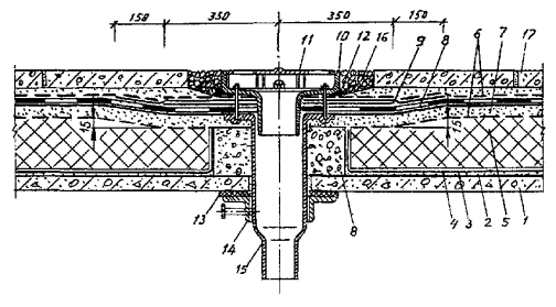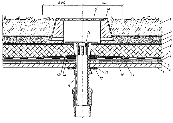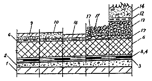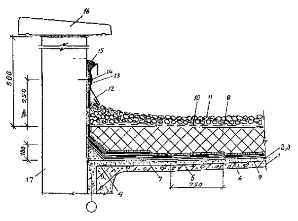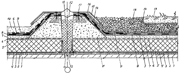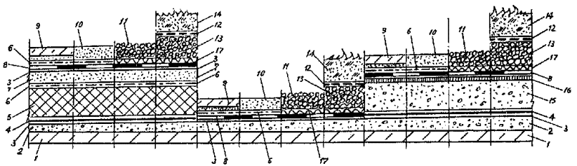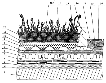 Газон из очитков нуждается в выпалывании высокорослых сорняков, особенно однолетних. Полив такого газона производится лишь в первые 6 - 7 недель после укладки на крышу. Удобрения вносятся в случае появления красно-бурой окраски листьев и побегов очитков, свидетельствующей, о недостатке элементов минерального питания в субстрате. Обычно удобрения вносят один раз в год. Средняя норма - 30 г комплексных удобрений на 1 м2. Такой газон не нуждается в скашивании. Газон из злаковых трав регулярно поливается и скашивается. При достижении побегами 10 - 12 см, с целью недопущения выхода растения в колос и связанной с этим потери декоративности. Побеги срезаются до 5 - 7 см. ПРИЛОЖЕНИЕЗАРУБЕЖНЫЙ ОПЫТ УСТРОЙСТВА ЭКСПЛУАТИРУЕМЫХ КРЫШЗа рубежом разработано несколько систем садов на крышах, которые обеспечивают наиболее оптимальные условия для развития растений, а также снижения статической нагрузки на кровлю. Одна из таких систем - Флорадрен фирмы IМРЕRВЕL (Бельгия) была на практике осуществлена на строительстве здания Газпрома в Москве и показала свою высокую эффективность (рис. 14). Основным конструктивным элементом этой системы являются прочные полиэтиленовые элементы флорадрен ячеистой формы размером 2×1 м и весом 2 кг/м2. Они обладают высокой эластичностью, хорошим сопротивлением к сжатию, высоким сопротивлением на разрыв. При устройстве озелененной кровли эти элементы дают возможность накапливать дождевые воды для увлажнения растений. Кроме того, система Флорадрен предусматривает гидроизоляционный слой и специальный противокорневой материал, дающий хорошую защиту от корней растений. Однако эта система требует применения специальных материалов (у нас они не выпускаются), что вызывает необходимость привлечения иностранных фирм. УСТРОЙСТВО «САДА НА КРЫШЕ» С ПРИМЕНЕНИЕМ СИСТЕМЫ FLORADRAIN ЭКСПЛУАТИРУЕМАЯ КРОВЛЯ (инверсионный вариант) Рис. 14 1. Бетонное основание 2. Выравнивающая цементная стяжка 3. Праймер РIМЕR S1 4. Нижний слой гидроизоляционного ковра из материала DERBIGUM 5. Верхний слой гидроизоляционного ковра из материала DERBIGUM 6. Утеплитель с закрытыми порами (экструзионный пенополистирол) 7. Полиэтиленовая пленка 8. Геотекстиль (мат) 9. Сотовый элемент FLORADRAIN 10. Керамзитовый гравий мелкой фракции 11. Геотекстиль 12. Засыпка земляным растительным слоем 13. Бетонная подушка под бордюрный камень 14. Бордюрный камень 15. Гравий фракции 5-20 16. Бетонная плитка 17. Зеленые насаждения В Москве фирма ЗАО «ДИАТ» освоила устройство эксплуатируемых, в том числе и озелененных покрытий подземных гаражей с применением материалов и технологий фирмы IМРЕRВЕL (Бельгия). При этом фирма «ДИАТ» использует наиболее прогрессивное конструктивное решение покрытия с кровлей в инверсионном варианте, т.е. с размещением водоизоляционного ковра под теплоизоляцией. Такое решение обеспечивает высокую долговечность водоизоляционного ковра в связи с тем, что он в процессе эксплуатации в гораздо меньшей степени подвергается воздействию атмосферных факторов и работает в узком диапазоне температур. В качестве теплоизоляции используется плитный экструзионный пенополистирол, имеющий низкое водопоглощение, что исключает возможность его увлажнения и размораживания в процессе эксплуатации кровли. В качестве гидроизоляционного материала применяется бельгийский материал фирмы 