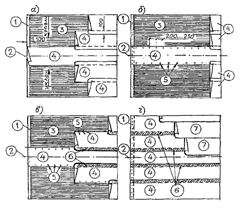 Примечание: запрещается стяжку из литого асфальтобетона предусматривать по теплоизоляции из пенопласта или с применением гранул пенопласта 4-3-3. Температурно-усадочные швы в стяжках шириной до 5 мм должны быть перекрыты полосами шириной 150 мм из рулонного водоизоляционного материала с точечной приклейкой их с одной стороны шва. 4-3-4. В местах примыкания к стенам, парапетам и другим конструктивным элементам, проходящим через кровлю, должны быть выполнены наклонные бортики (галтели) под углом 45° из цементно-песчаного раствора или асфальтобетона; высота их должна быть около 100 мм. Вертикальные поверхности конструкций, выступающих над кровлей и выполненных из кирпича или блоков, должны быть оштукатурены цементно-песчаным раствором на высоту подъёма дополнительного водоизоляционного ковра, но не менее 350 мм. 4-4. Водоизоляционный ковёр (табл. 3.1 позиция 8)4-4-1. В эксплуатируемых кровлях и инверсионный и традиционный варианты эксплуатируемых кровель предъявляют высокие требования к водоизоляционному ковру, т.к. при протечках возникают значительные трудности в определении мест его повреждения и выполнении ремонтных работ из-за необходимости, в большинстве случаев, снятия верхних защитных слоев кровли и даже теплоизоляционного слоя (в инверсионной кровле). В связи с этим, ковёр следует предусматривать из трёх слоев наплавляемых рулонных материалов с гибкостью при отрицательных температурах не выше минус 15°С, например изопласт, днепрофлекс и др. либо из двух слоев рулонных материалов с аналогичным показателем гибкости, один из которых толщиной не менее 4 мм с двумя армирующими основами, например «Дербигум» (см. Приложение 4-2), и другой слой с одной армирующей основой. 4-4-2. Для повышения эксплуатационной надёжности кровельного ковра, укладываемого на увлажненное основание под кровлю (выравнивающую стяжку), необходимо предусматривать укладку нижнего слоя водоизоляционного ковра с точечным креплением полотнищ рулонного материала дюбелями с шайбами в местах нахлёстки смежных полотнищ материала с последующей приклейкой этих мест (рис. 1). В этих случаях в местах примыкания кровли к выступающим конструкциям (парапетам, стенам и др.) необходимо предусматривать выход воздуха наружу за счёт наклейки нижнего полотнища дополнительного водоизоляционного ковра только в местах сопряжения с основным водоизоляционным ковром (рис. 2). 4-4-3. Не допускается применение холодных (на растворителях) мастик в кровлях, выполненных с применением пенопластовых, пенополистирольных, минераловатных плит и композиционной теплоизоляции с применением пенополистирола. Рис. 1 Последовательность (а, б, в, г) раскладки рулонных материалов при устройстве водоизоляционного ковра с механическим закреплением нижнего слоя. 1 - переходный наклонный бортик; 2 - линия водораздела; 3 - основание под кровлю; 4 - нижний слой водоизоляционного ковра; 5 - шайбы с дюбелями; 6 - наклейка полотнищ в местах нахлесток; 7 - верхний (второй) слой водоизоляционного ковра Рис. 2 Примыкание кровли к парапету (стене) при механическом закреплении нижнего слоя водоизоляционного ковра 1 - сборная железобетонная плита покрытия; 2 - пароизоляция (по расчету); 3 - теплоизоляция; 4 - выравнивающая стяжка; 5 - механически закрепляемый нижний слой основного водоизоляционного ковра; 6 - верхний слой основно