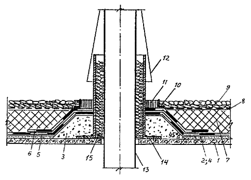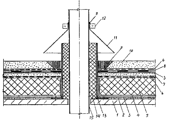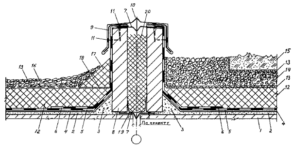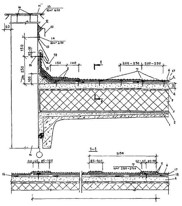 4. ТРЕБОВАНИЯ К ЭЛЕМЕНТАМ ПОКРЫТИЯ И КРОВЛИ4-1. Пароизоляция (табл. 3.1 позиция 4)4-1-1. Пароизоляция для предохранения теплоизоляционного слоя и основания под кровлю от увлажнения должна предусматриваться в соответствии с требованиями главы СНиП II-3-79* «Строительная теплотехника», изд. 1998 г.; 4-1-2. В местах примыкания покрытий к стенам, шахтам и оборудованию, проходящему через покрытие или чердачное перекрытие, Пароизоляция должна быть поднята на высоту, равную толщине теплоизоляционного слоя, а в местах деформационных швов должна перекрывать края металлического компенсатора. 4-1-3. Для пароизоляции должны быть применены современные битуминозные материалы, например, наплавляемые рулонные материалы без крупнозернистой посыпки с армирующей долговечной основой из стекломатериалов или синтетических волокон, как наиболее эффективные по технологии укладки (см. Приложение 4-1, 4-2). 4-2. Теплоизоляция (табл. 3.1, позиции 5 и 15)4-2-1. Толщину теплоизоляции покрытия устанавливают расчетным путём по главе СНиП II-3-79* с учётом теплоизолирующих свойств остальных слоев покрытия; теплоизоляционные качества участков и узлов с повышенной теплопроводностью следует определять путем расчета температурных полей, который производится компьютерным центром ОАО «Моспроект». 4-2-2. Учитывая относительно высокие нагрузки на теплоизоляцию в эксплуатируемых кровлях традиционного варианта (особенно в местах проезда и стоянок автомобильного транспорта), её следует предусматривать, как правило, из плитных материалов с прочностью на сжатие не менее 1,5 кгс/см2, к которым, в первую очередь, относятся пенополистирольные плиты, обладающие наиболее высокими теплозащитными свойствами и низким весом, например экструдированный пенополистирол по ТУ 2244-001-47547616-00, ТУ 5767-002-46261013-99 или пенополистирольные плиты, изготавливаемые безпрессовым способом (Приложение 4-3). 4-2-3. Плитную теплоизоляцию (См. Приложения 4-4 и 4-5) предусматривают из 2-х и более слоев, что позволяет располагать плиты вразбежку с перевязкой швов между ними. 4-2-4. Теплоизоляцию эксплуатируемой кровли в инверсионном варианте следует предусматривать только из плитного экструзионного пенополистирола, характеризующегося низким водопоглощением, что исключает возможность его увлажнения и размораживания в процессе эксплуатации кровли. 4-2-5. На неутепленном (холодном) чердаке теплоизоляцию перекрытия над помещениями следует предусматривать, как правило, из волокнистых или засыпных материалов (см. Приложение 4-6 и 4-7); для эксплуатации чердачного пространства необходимо по таким утеплителям устраивать пешеходные мостики (дорожки). 4-3. Основание под водоизоляционный ковёр (табл. 3.1, позиции 2, 7 и 16)4-3-1. В эксплуатируемой кровле по инверсионному варианту и в кровле на покрытии не утепленного (холодного) чердака основанием под водоизоляционный ковер служит огрунтованная поверхность цементно-песчаной затирки толщиной 10...15 мм по уклонообразующему слою (табл. 4.1, позиция 2). В качестве грунтовки применяют состав (называемый Праймер), приготовленный из битума и керосина, взятых в соотношении 1:3 (по весу) или из холодных мастик (Приложение 4-8), разбавленных растворителем в соотношении 1:2. 4-3-2. В традиционном варианте кровли основанием под водоизоляционный ковёр служат огрунтованные поверхности цементно-песчаных стяжки или затир