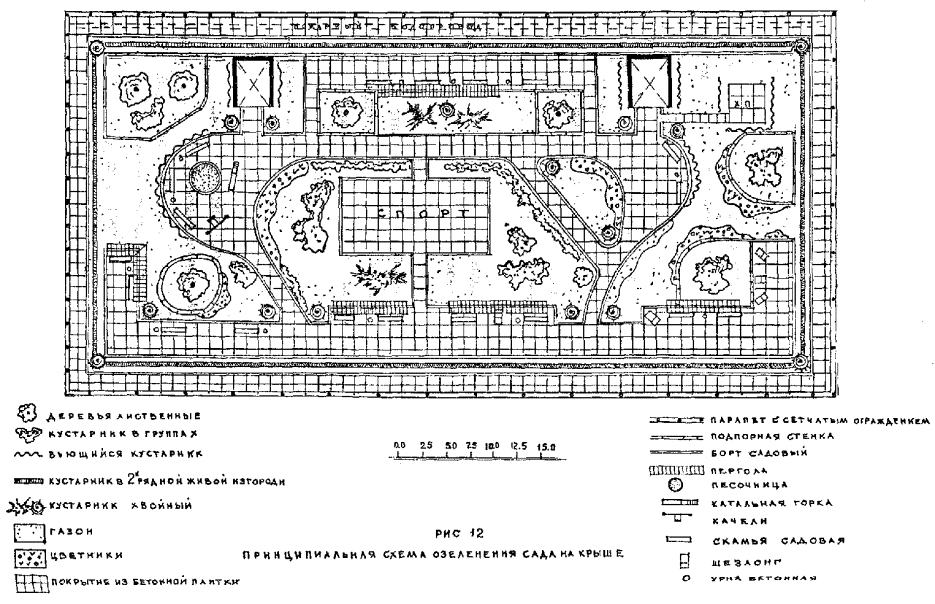 Ограждение спортивных площадок выполняется из металлической сетки на столбах из труб. Его высота 3 - 4 м, причем сетка закрепляется сверху, образуя нечто вроде клетки. 10-15. На территории садов на крышах могут быть устроены детские площадки и площадки отдыха взрослого населения. Площадки отдыха взрослого населения должны устраиваться таким образом, чтобы была обеспечена возможность просмотра окрестностей через проемы в парапете ограждения. На них устанавливаются скамьи и столики, возможно устройство пергол, увитых вьющимися растениями. Столики и скамьи должны быть удалены от парапета на расстояние не менее 1,5 м, с тем чтобы исключить возможность лазания детей на парапет ограждения. На детских площадках могут быть установлены следующие малые формы: Таблица 10.4