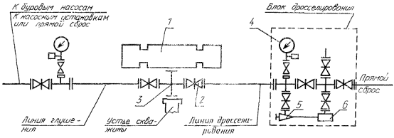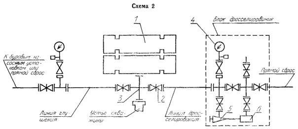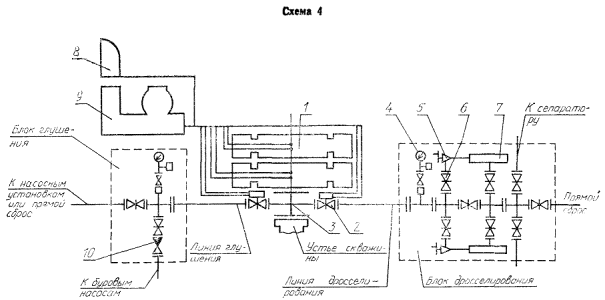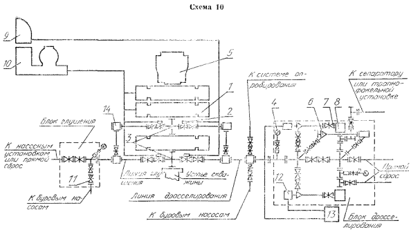 1 - плашечный превентор; 2 - задвижка с гидравлическим управлением; 3 - устьевая крестовина; 4 - манометр с запорным и разрядным устройствами и разделителем сред; 5 - дроссель регулируемый с ручным управлением; 6 - задвижка с ручным управлением; 7 - гаситель потока; 8 - вспомогательный пульт; 9 - станция гидравлического управления; 10 - обратный клапан Черт. 4