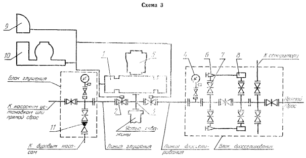 1 - плашечный превентор; 2 - задвижка с гидравлическим управлением; 3 - устьевая крестовина; 4 - манометр с запорным и разрядным устройствами и разделителем сред; 5 - кольцевой превентор; 6 - дроссель регулируемый с ручным управлением; 7 - задвижка с ручным управлением; 8 - гаситель потока; 9 - вспомогательный пульт; 10 - станция гидропривода; 11 - обратный клапан Черт. 5