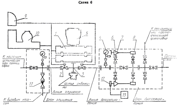 1 - плашечный превентор; 2 - задвижка с гидравлическим управлением; 3 - устьевая крестовина; 4 - манометр с запорным и разрядным устройствами и разделителем сред; 5 - кольцевой превентор; 6 - дроссель регулируемый с ручным управлением; 7 - задвижка с ручным управлением; 8 - гаситель потока; 9 - вспомогательный пульт; 10 - станция гидропривода; 11 - обратный клапан; 12 - регулируемый дроссель с гидравлическим управлением; 13 - пульт управления гидроприводным дросселем Черт. 6