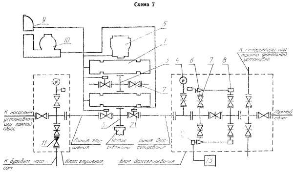 1 - плашечный превентор; 2 - задвижка с гидравлическим управлением; 3 - устьевая крестовина; 4 - манометр с запорным и разрядным устройствами и разделителем сред; 5 - кольцевой превентор; 6 - дроссель регулируемый с ручным управлением; 7 - задвижка с ручным управлением; 8 - гаситель потока; 9 - вспомогательный пульт; 10 - станция гидропривода; 11 - обратный клапан; 12 - регулируемый дроссель с гидравлическим управлением; 13 - пульт управления гидроприводным дросселем Черт. 7