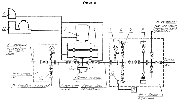 1 - плашечный превентор; 2 - задвижка с гидравлическим управлением; 3 - устьевая крестовина; 4 - манометр с запорным и разрядным устройствами и разделителем сред; 5 - кольцевой превентор; 6 - дроссель регулируемый с ручным управлением; 7 - задвижка с ручным управлением; 8 - гаситель потока; 9 - вспомогательный пульт; 10 - станция гидропривода; 11 - обратный клапан; 12 - регулируемый дроссель с гидравлическим управлением; 13 - пульт управления гидроприводным дросселем Черт. 8
